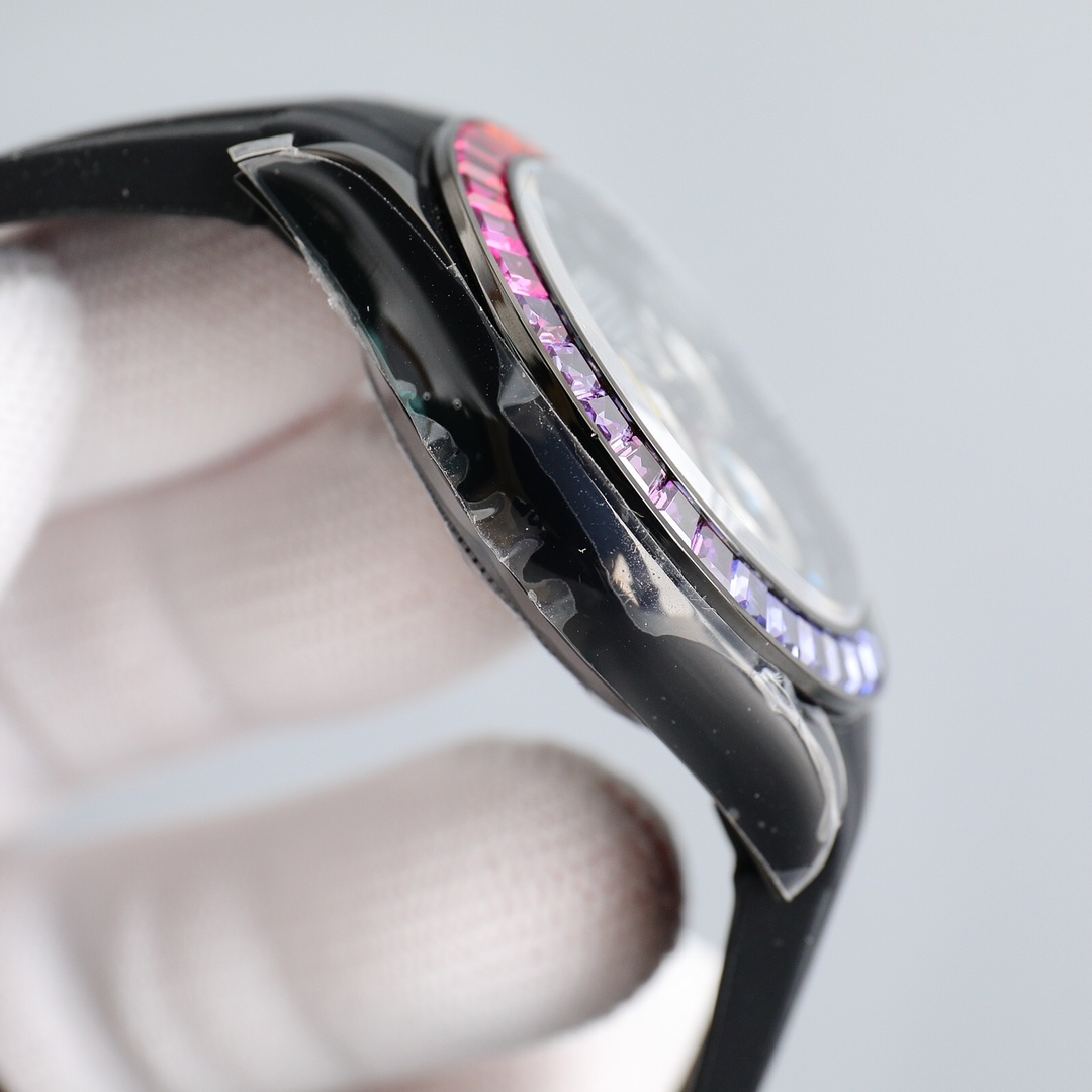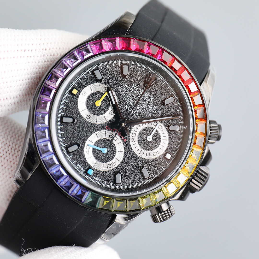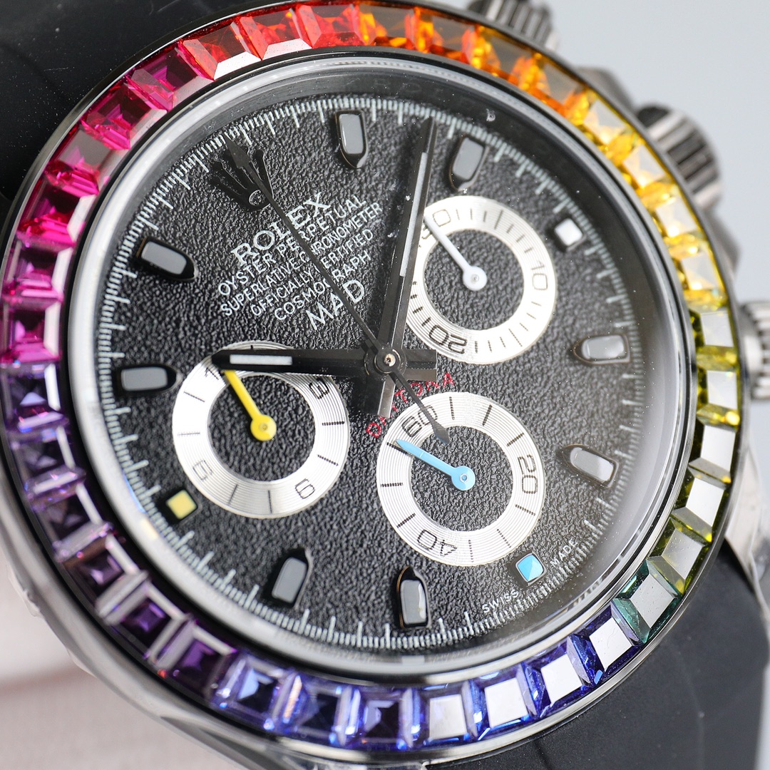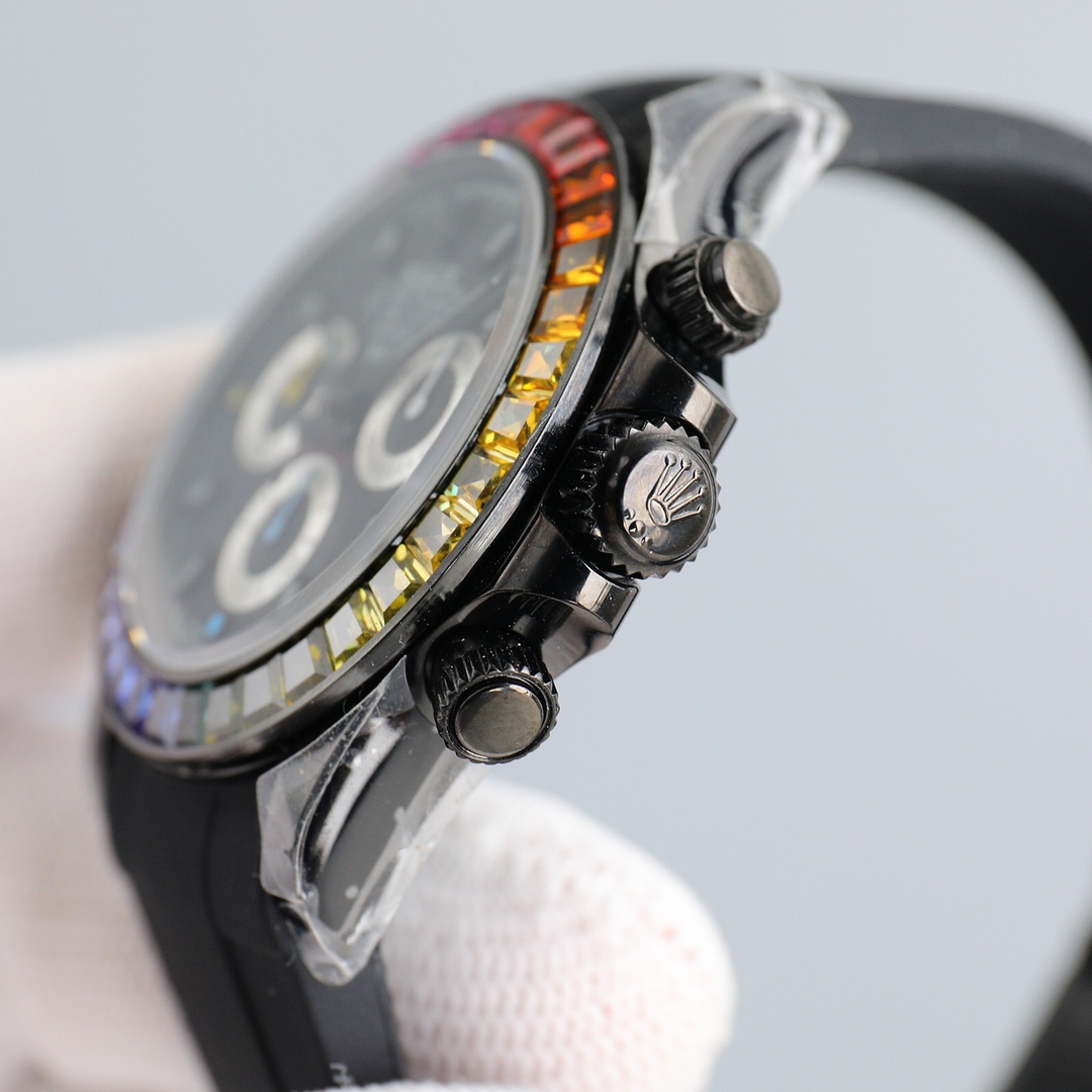 Ultra-thin upgraded rainbow diamond mm high-end quality real shot! All Black Steel Rainbow Daytona! Using the latest improved version of the movement (non-market 4L stainless steel polishing, each case is fully CNC processed with all details, and then polished and inspected through manual processes to ensure fine workmanship!! The ultra-thin movement is mechanical, the timing function is synchronized with the counter, and the strap is equipped to prevent The adjustable Oyster safety clasp and elegant solid link strap are comfortable to wear and very easy to operate! ⌚️ Comes with BLAKEN fever modification storage box tool and a pair of valuable straps! (If the accessories are lost, they are not refundable!) A sincere work, all watch friends are welcome to taste it!