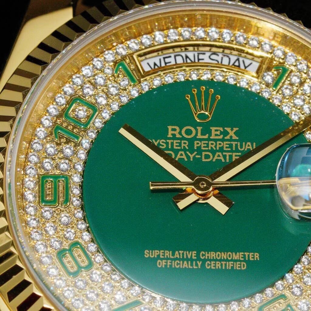 V⃣️The 6-point anti-counterfeiting mark on the glass is a dotted dot design and is located in the middle part of the display. 6⃣️The calendar grain on the sapphire glass is synchronized with the official electric blue light design. 7⃣️Each diamond is artificially inlaid with enamel text and arranged neatly. 8⃣️The green color of all fonts is consistent with the color of the strap! Rolex day-date 36mm series Rolex Gypsophila is like a shining star in the famous watch, with unparalleled temperament and charm. Its technology is delicate and ingenious, and its color and material are perfectly formed by crystals, exuding an elegant and elegant temperament! Attention is paid to every detail! Equipped with original buckle! The finale, making a shining debut!