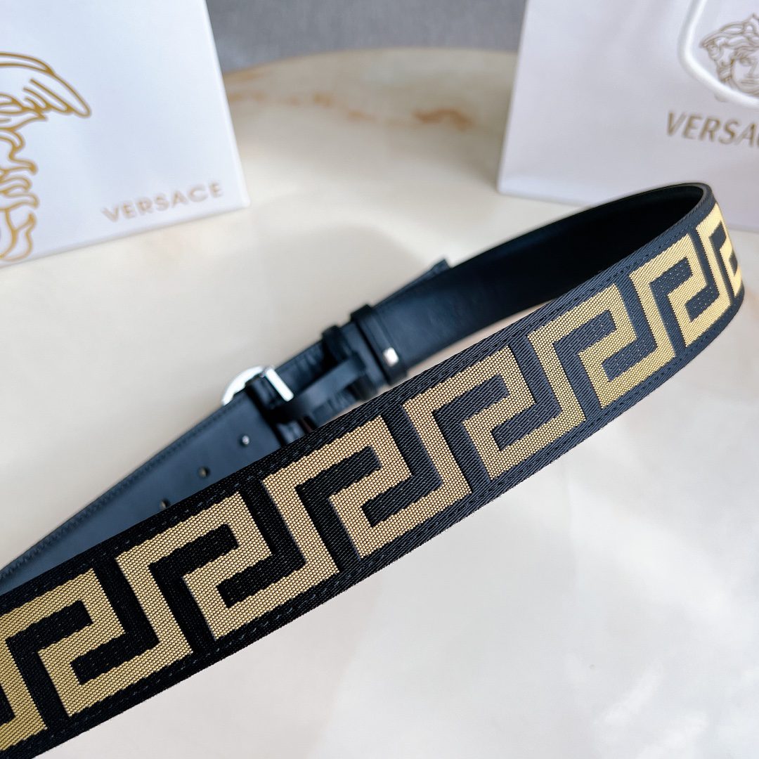 Versace 4.0cm wide, this casual belt is decorated with a Greek key pattern and the iconic Versace Medusa head buckle, highlighting the brand’s style. A beautiful wardrobe essential. D
