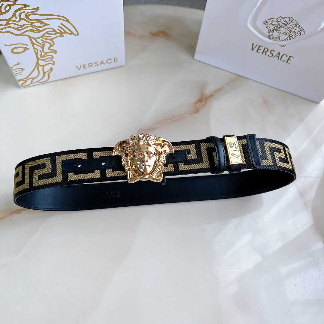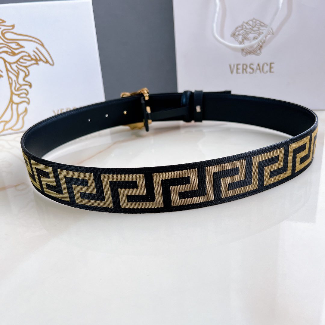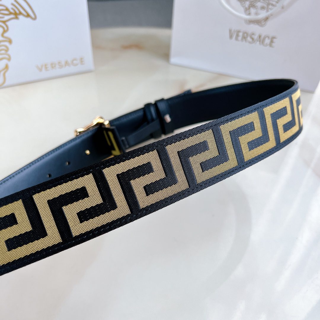 Versace 4.0cm wide, this casual belt is decorated with a Greek key pattern and the iconic Versace Medusa head buckle, highlighting the brand’s style. A beautiful wardrobe essential. D