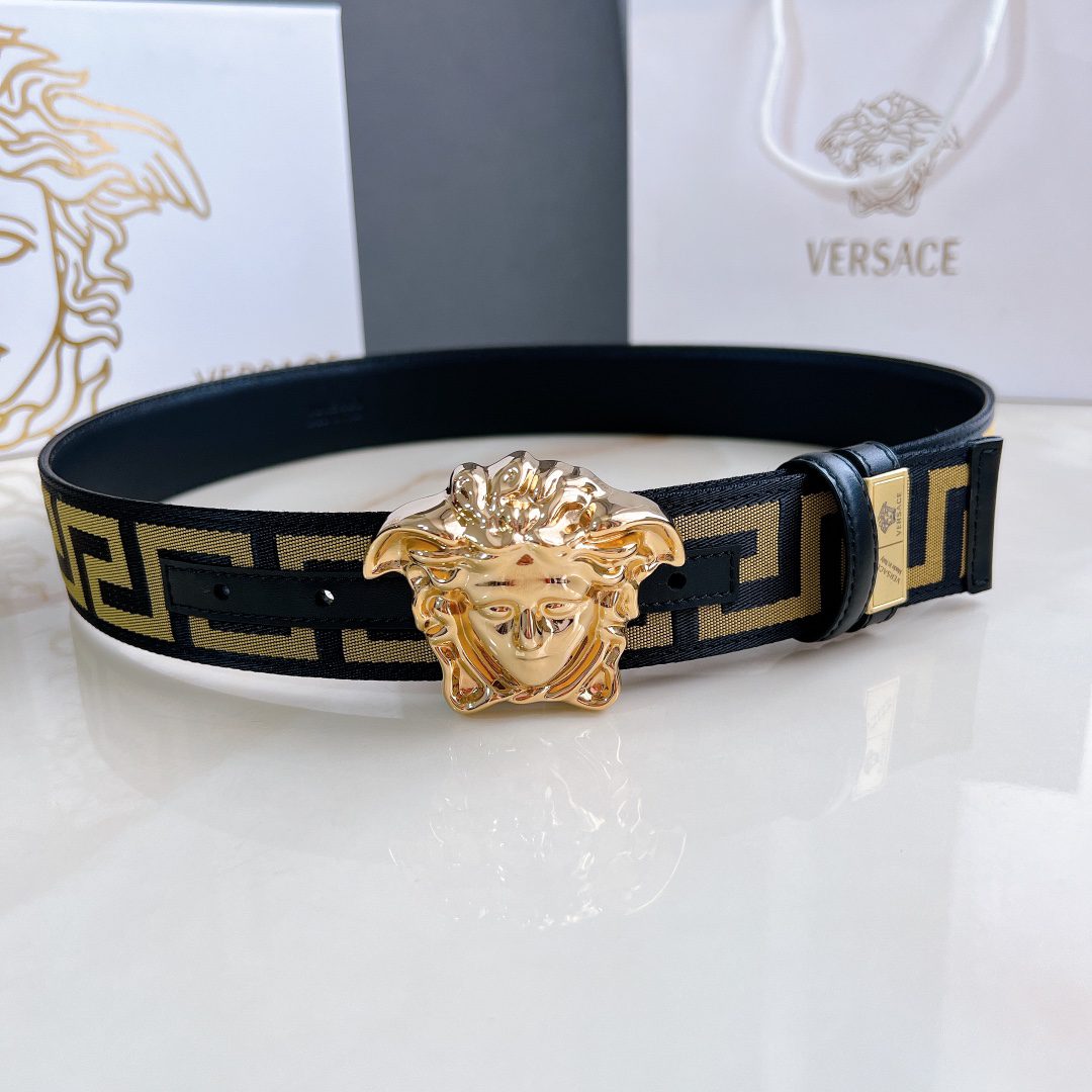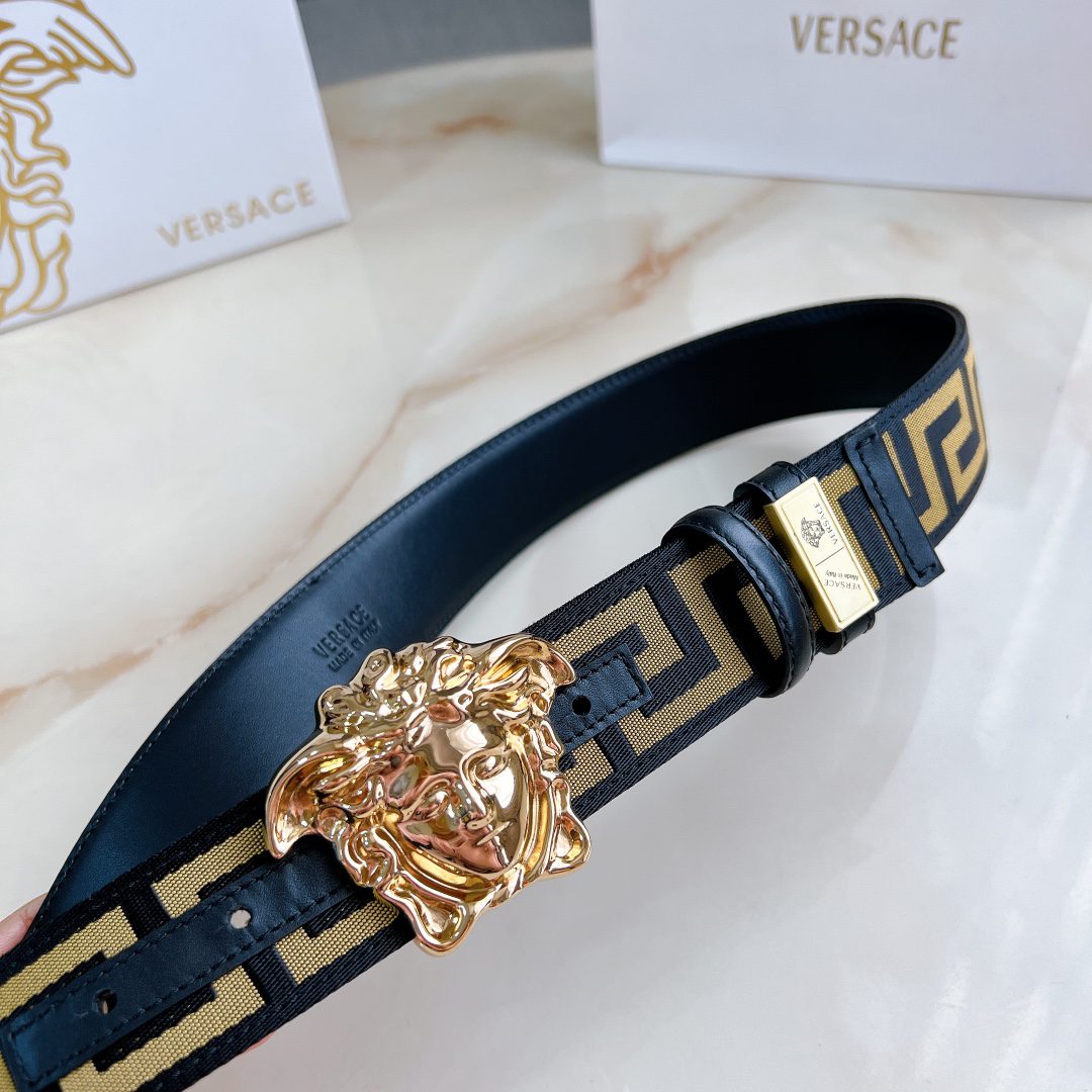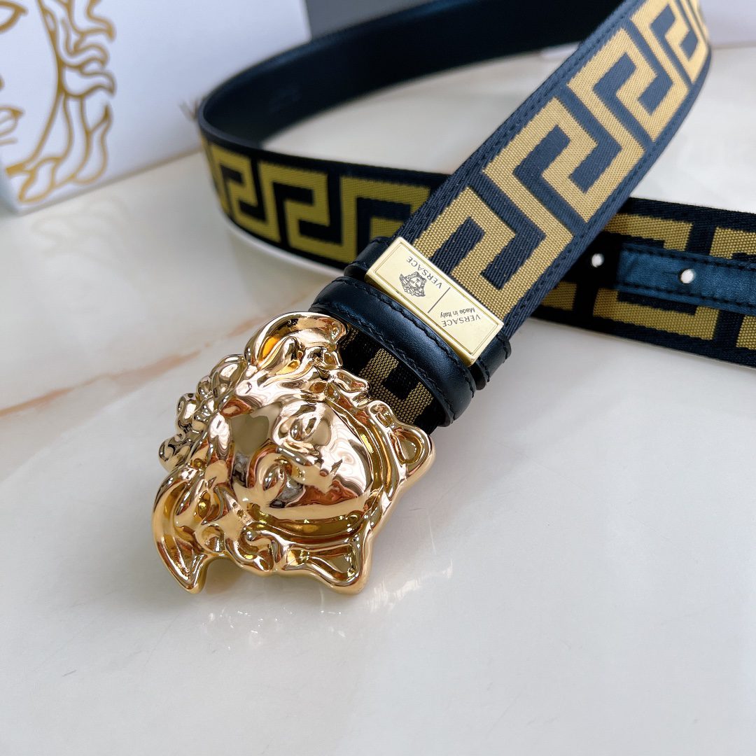 Versace 4.0cm wide, this casual belt is decorated with a Greek key pattern and the iconic Versace Medusa head buckle, highlighting the brand’s style. A beautiful wardrobe essential. D