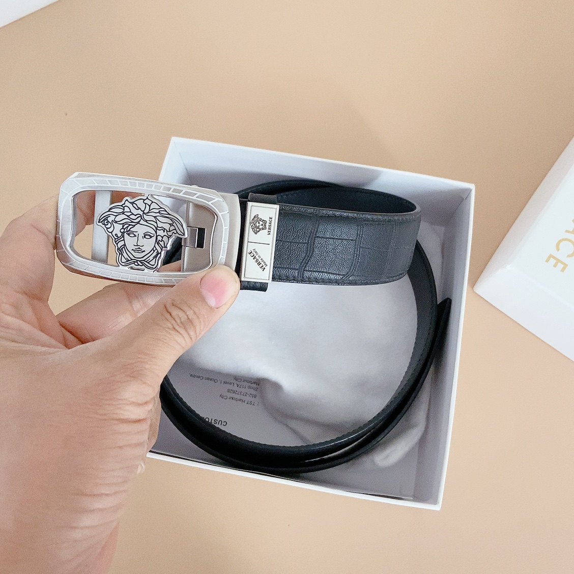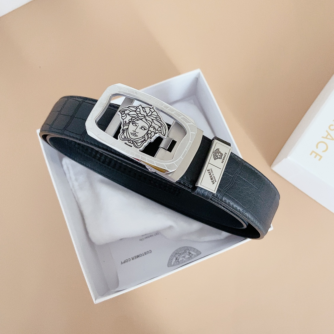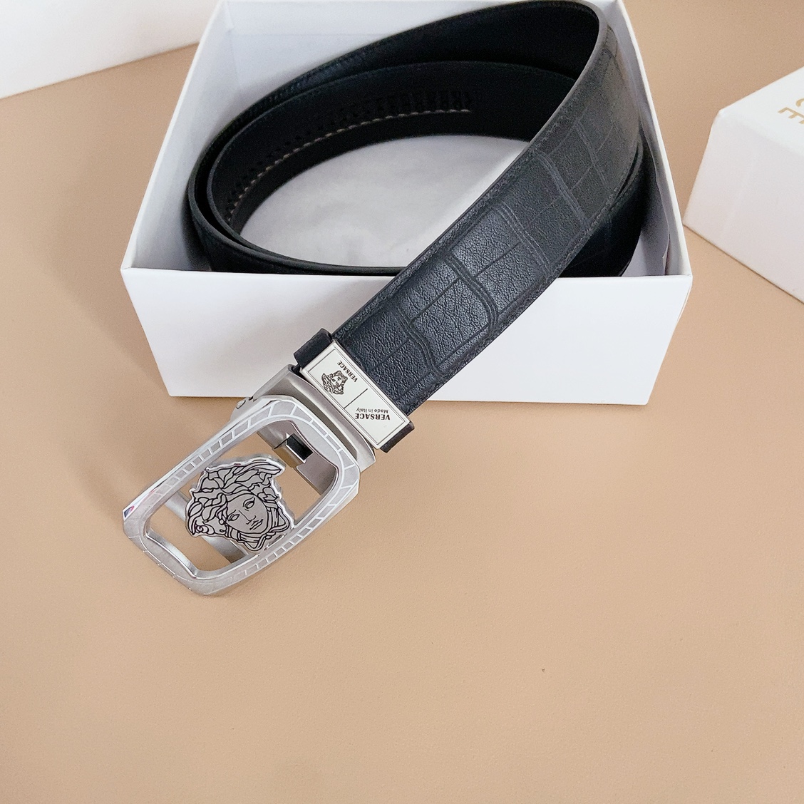 Belt Versace automatic strap with steel buckle, this Greek key embossed belt features a striking Medusa head $129.00 Original price was: $129.00.$89.00Current price is: $89.00.