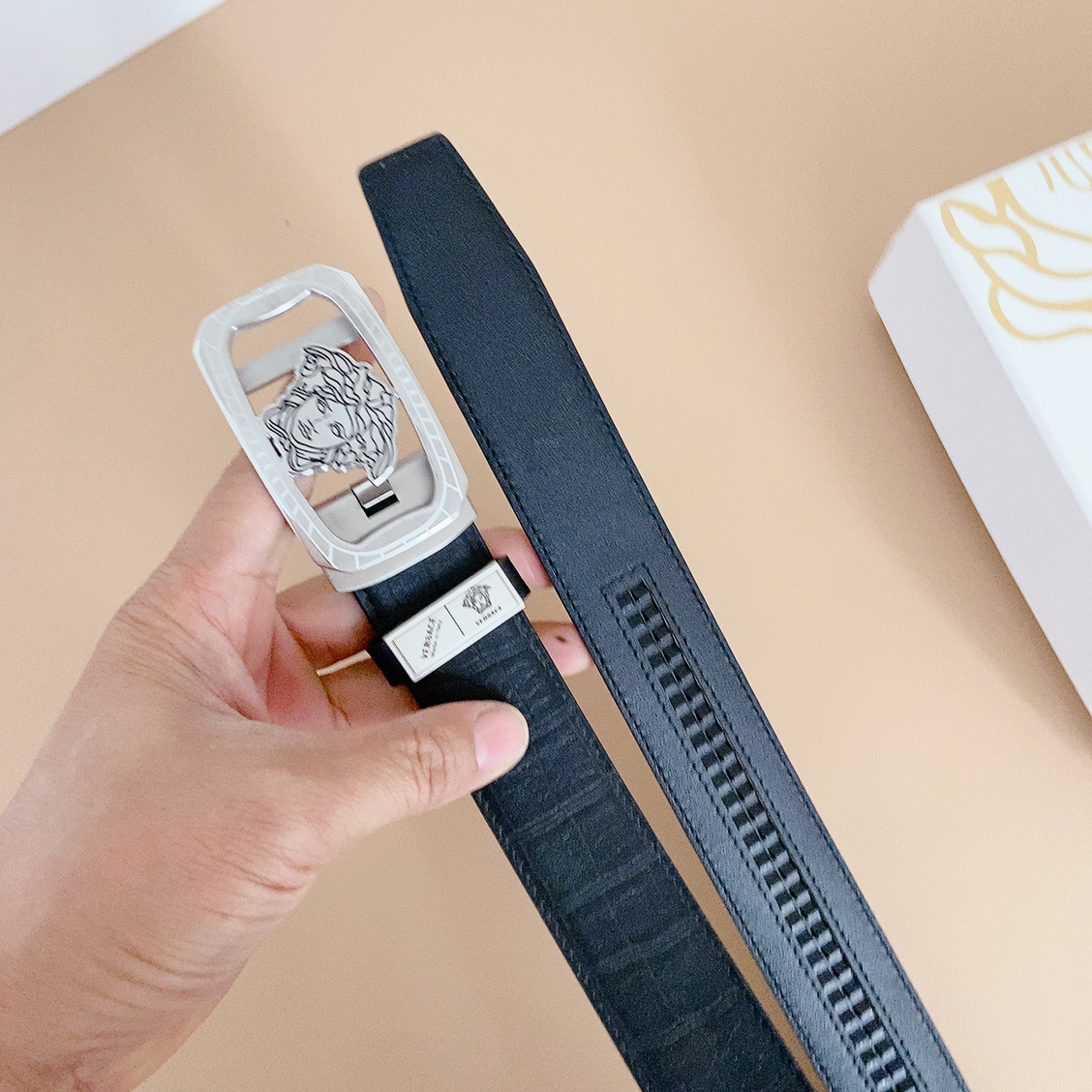 Versace automatic belt with steel buckle, this Greek key embossed belt is equipped with an eye-catching Medusa head buckle, which can add some three-dimensional elegance to any look. cm width D