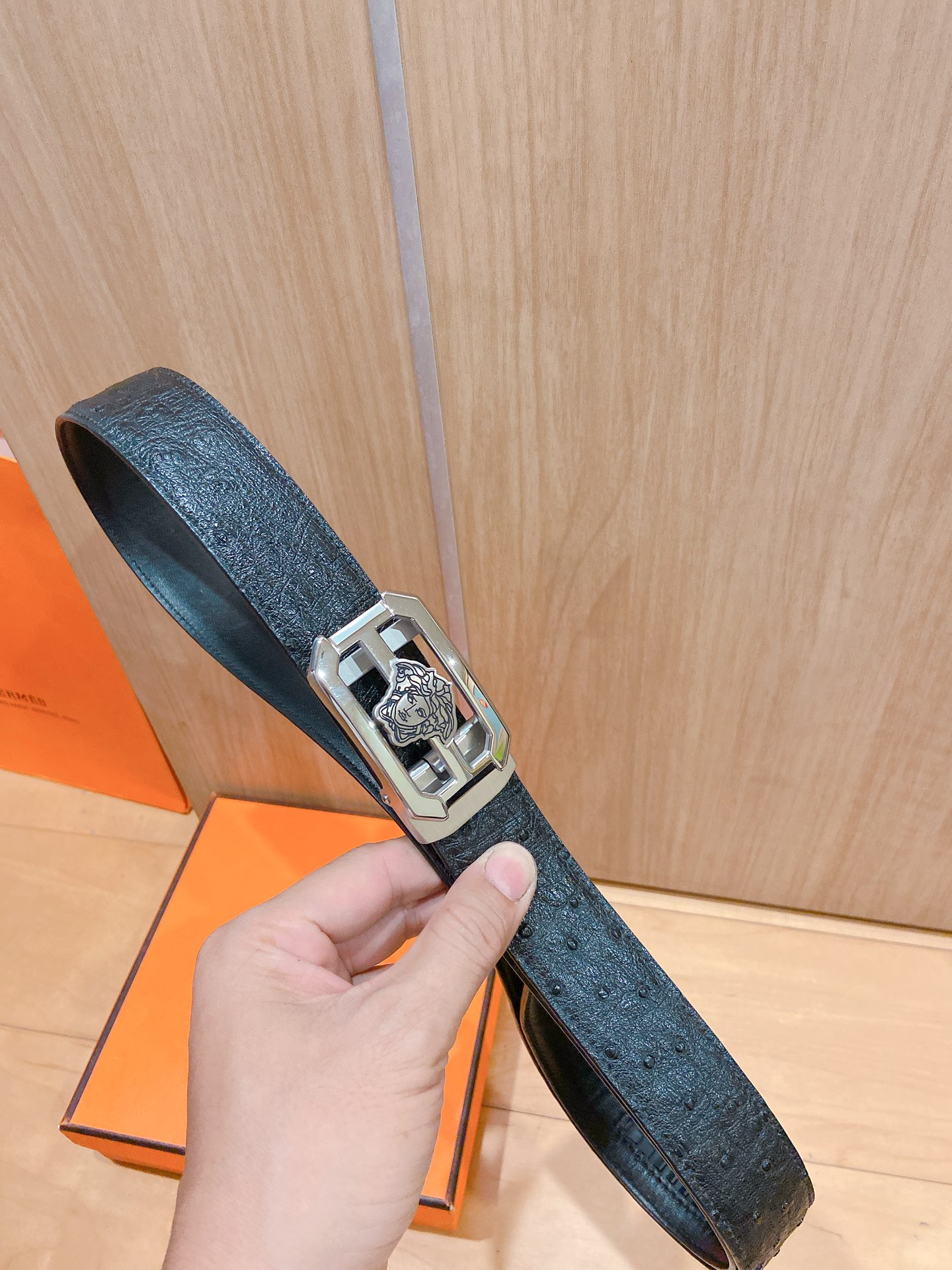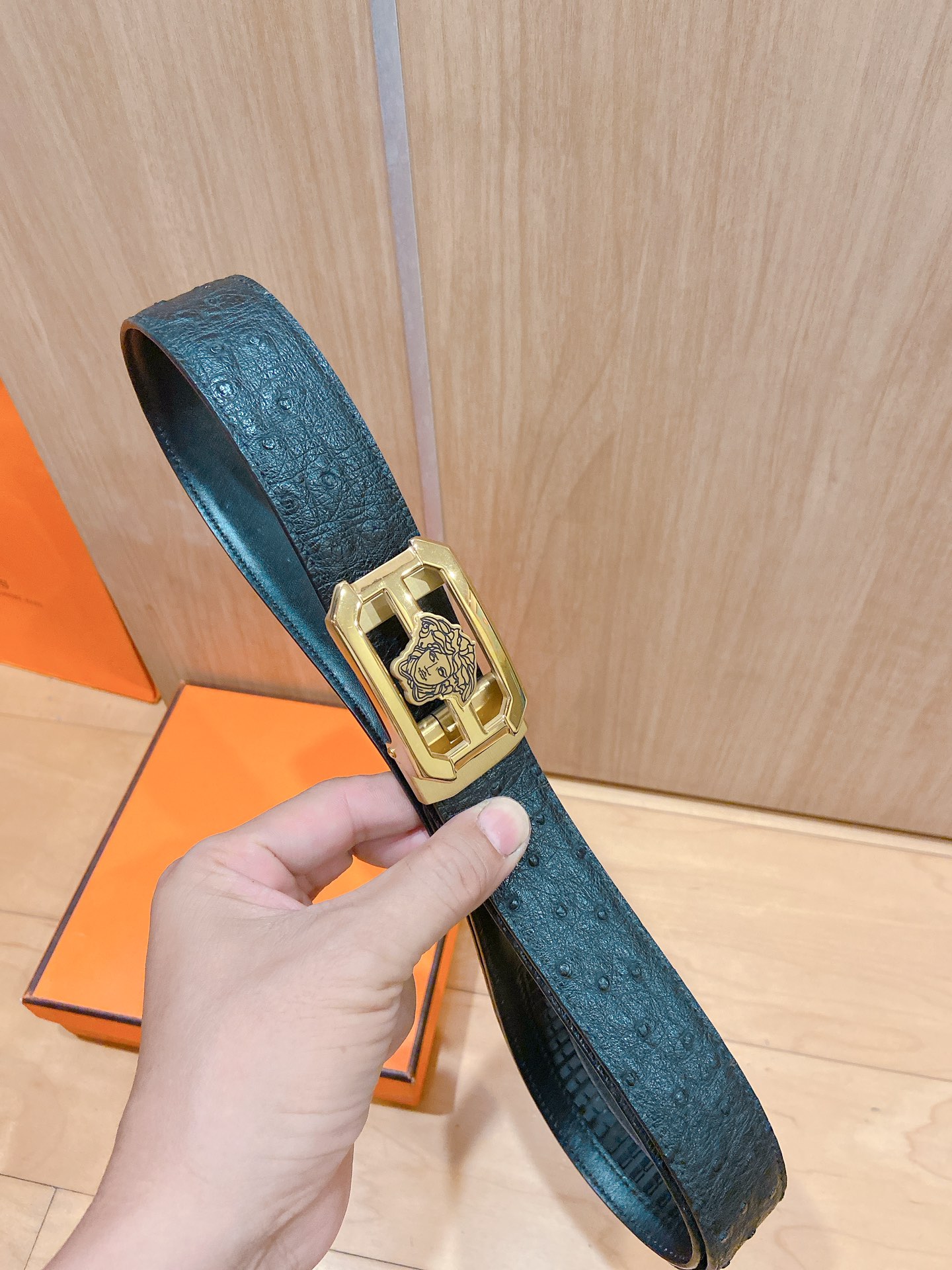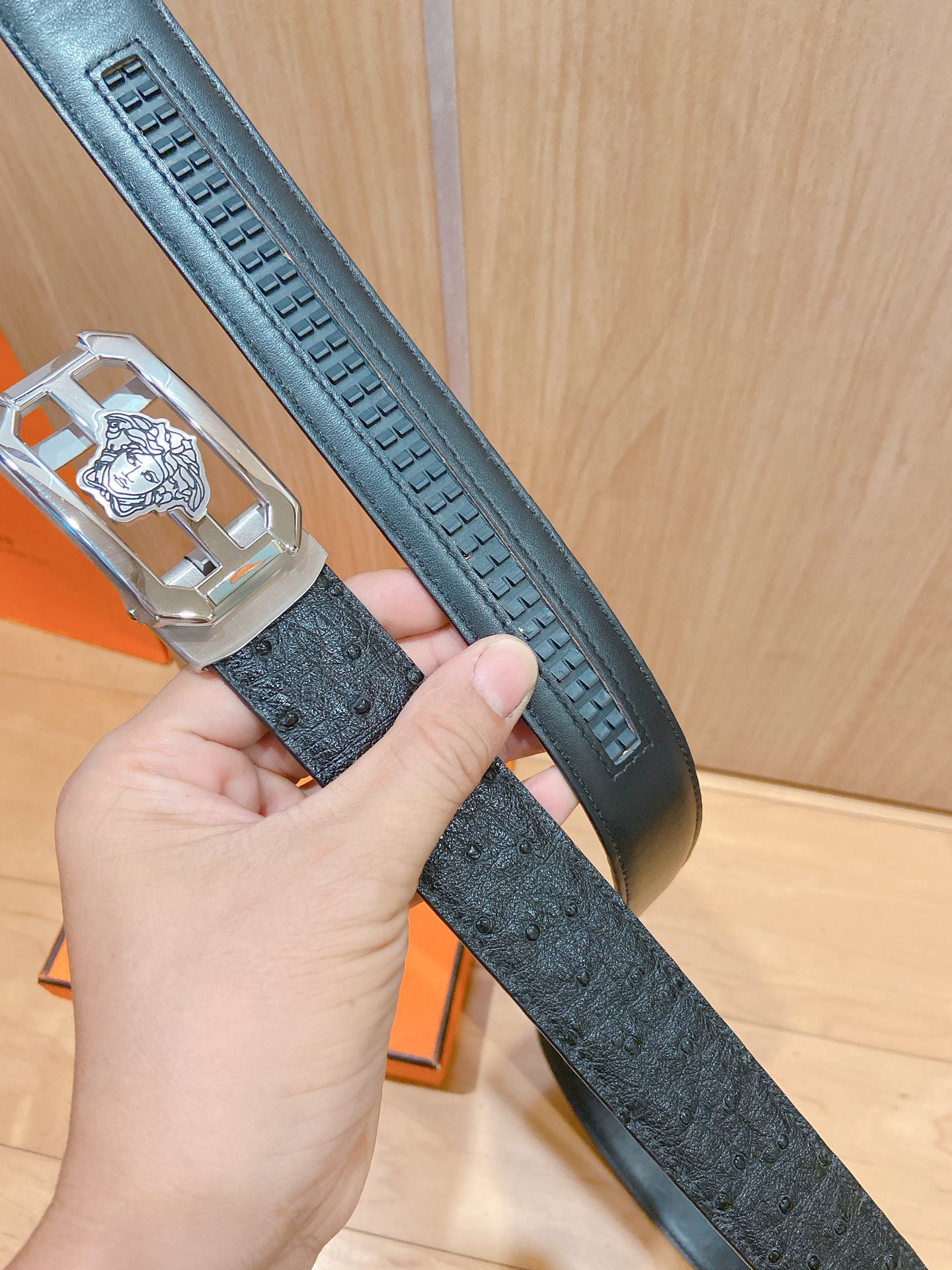 versace Versace automatic belt with steel buckle, ostrich leather, this Greek key embossed belt is equipped with an eye-catching Medusa head buckle, which can add some three-dimensional elegance to any look. cm width D