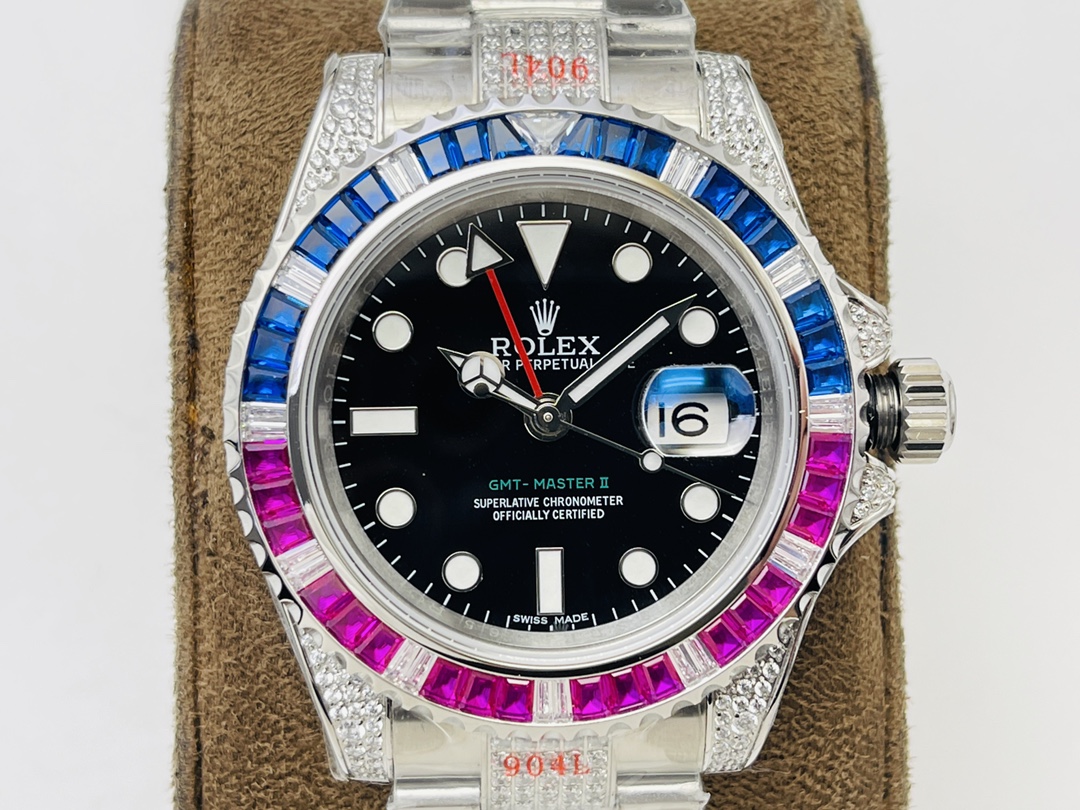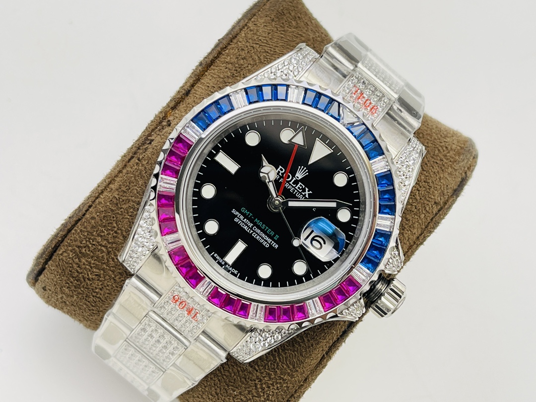 [VR Factory2022 Wall Crack Recommendation Luxurious Masterpiece] The highest version on the market, the Rolex GMT-Master II rear diamond-encrusted customized version! It is the best choice for luxury, sparkle and classic trend! MM! 2⃣️Every diamond and colored gem comes from Austria (the origin of Swarovski) and undergoes strict screening to ensure uniform color, size and fire, and is carefully set by a jewelry setter. 36 modified (GMT) automatic winding movement, strong stability! VR Factory’s ingenious masterpiece, welcome all friends to taste it!